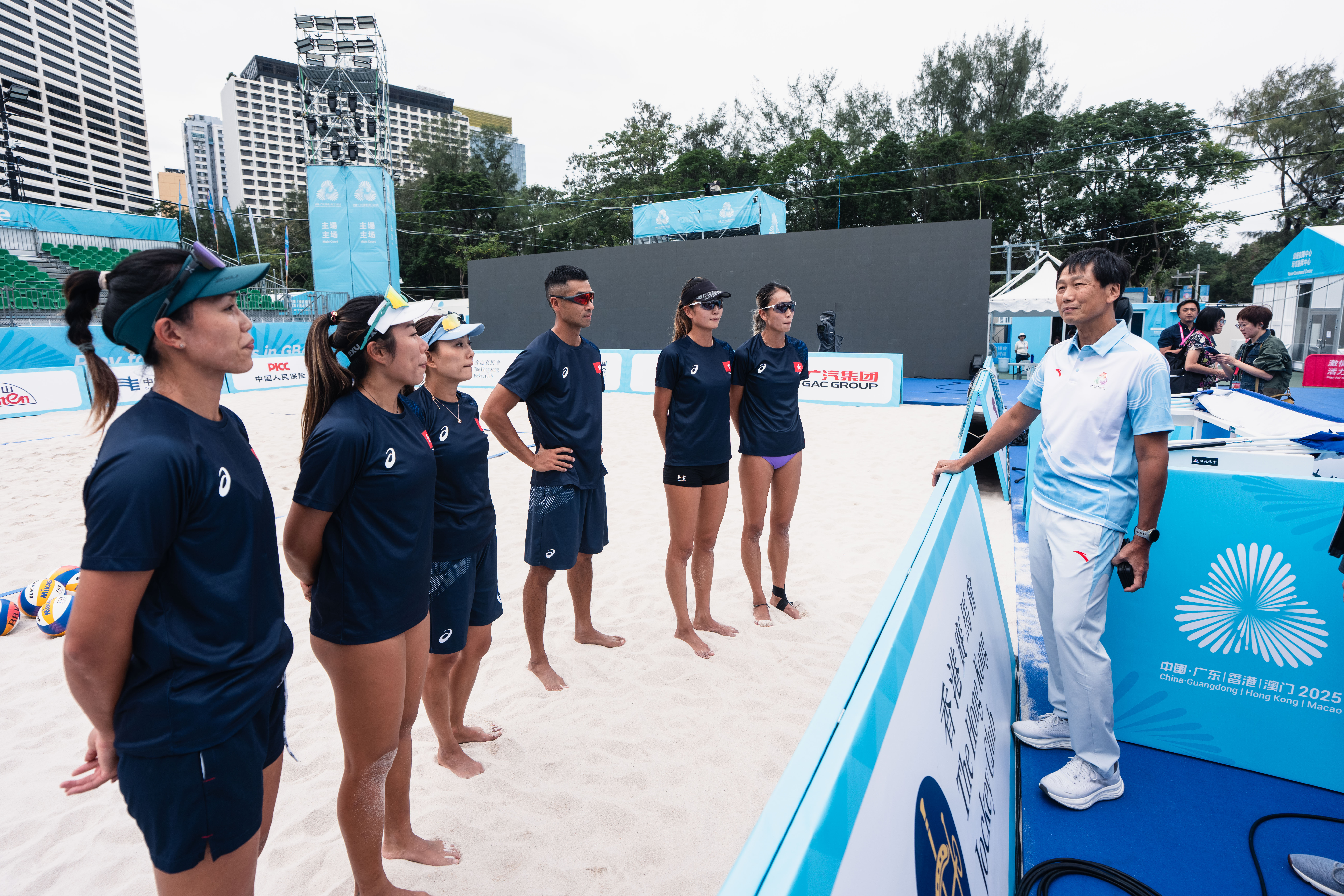 香港成年沙灘排球代表隊球員賽前訓練備戰。