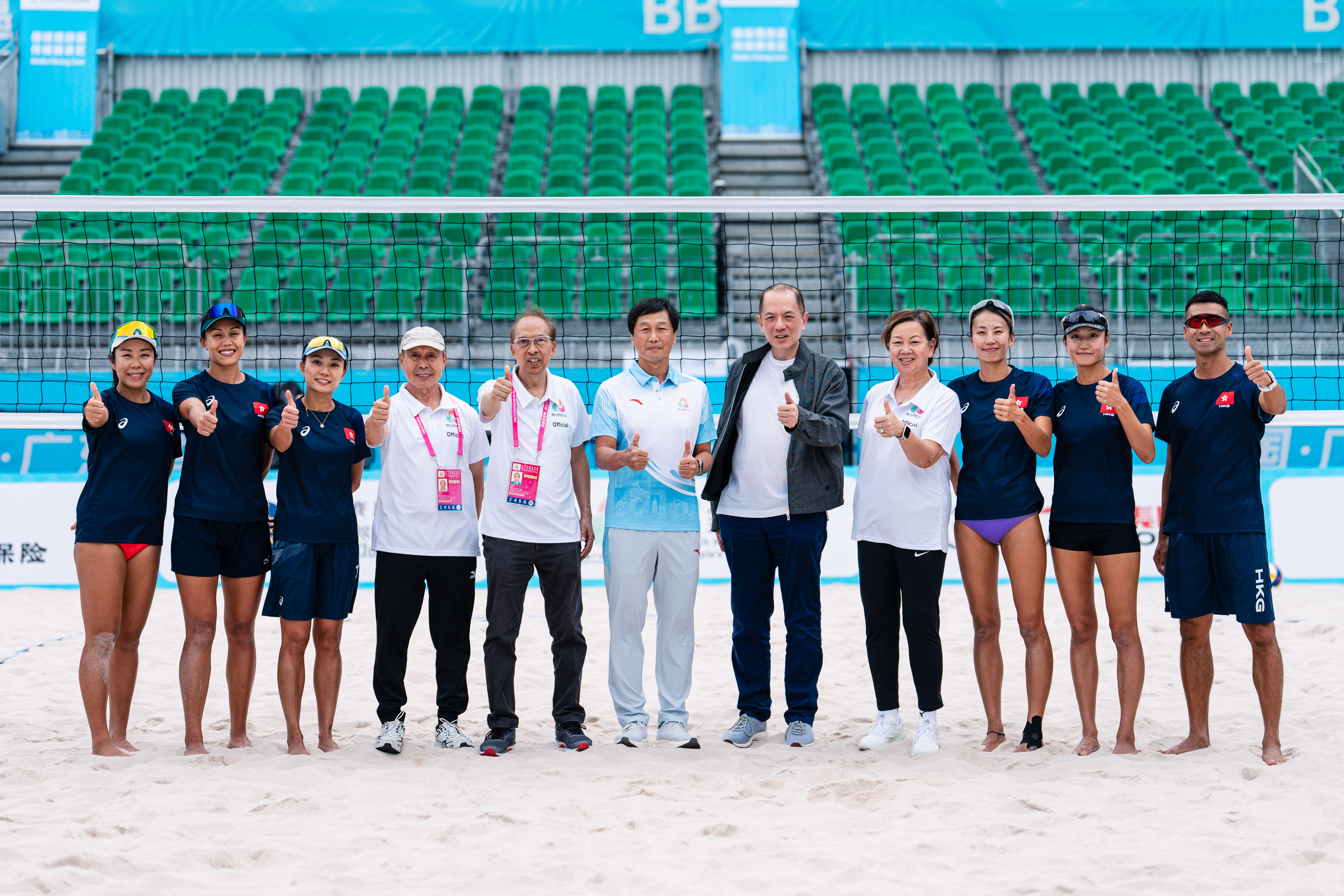 全國運動會統籌辦公室主任 楊德強先生(中)、中國香港排球總會會長 吳守基先生,GBS, JP(右五)、第十五屆全國運動會沙灘排球項目賽事組織委員會副主任 石徐惠芬 女士(右四)及委員 余偉強先生(左五)等在首日訓練期間到比賽場地視察,為港隊運動員打氣。