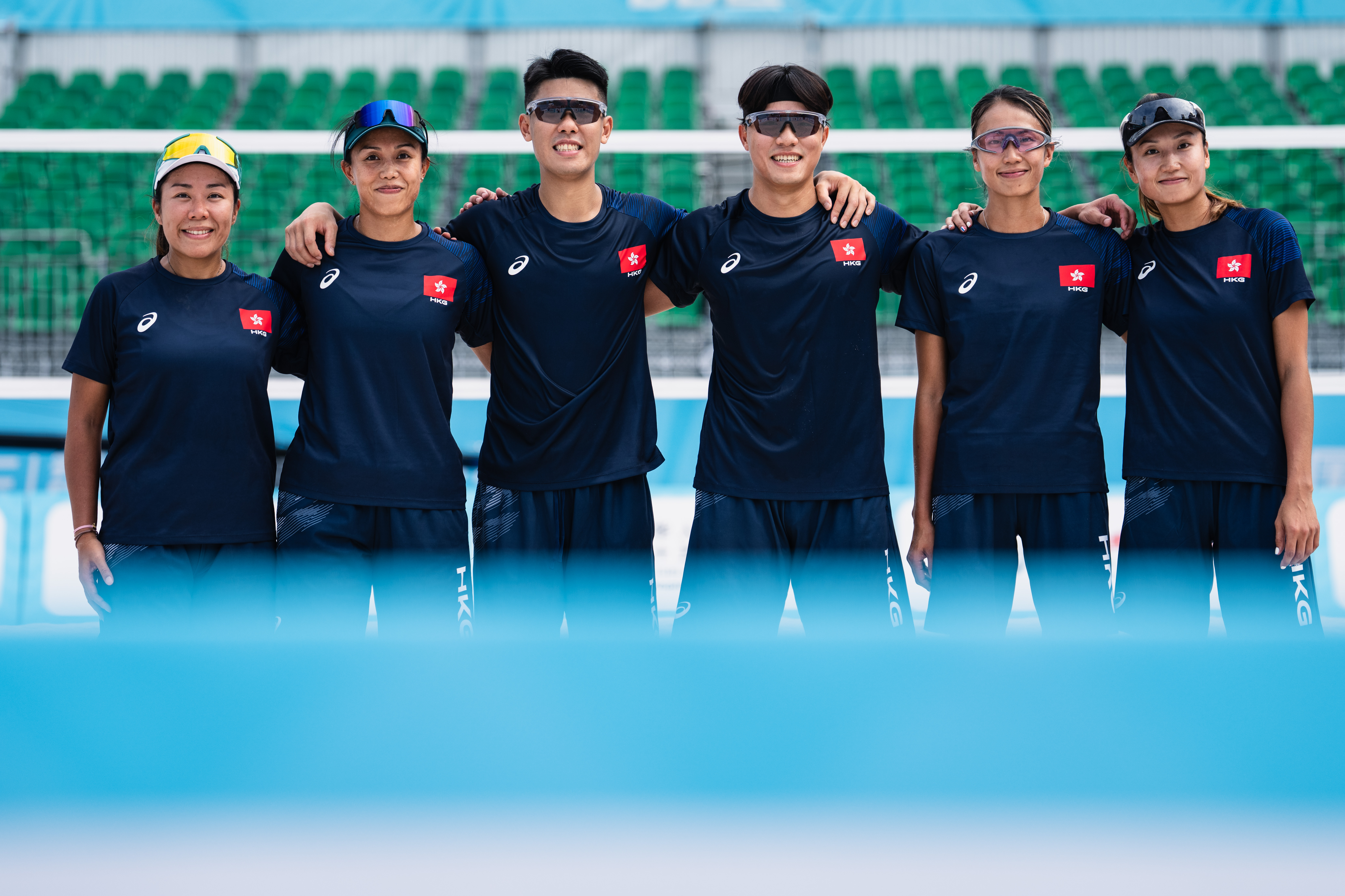 (左起)香港成年沙灘排球代表隊球員歐陽瑋欣、袁廷芝、謝鍵泓、黃嘉潤、杜詠彤及杜詠雯,在主場出戰第十五屆全國運動會沙灘排球項目前合照。