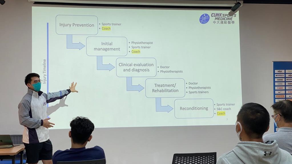 工作坊分為三個環節,分別是「預防受傷 (Injury Prevention)」、「復康 (Rehabilitation)」及「貼紮 (Taping)」,旨在加強運動創傷的知識及認識處理方法。